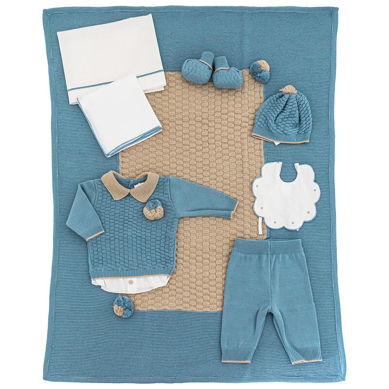 LA CONFEZIONE INCLUDE: COMPLETINO+CAPPELLO E SCARPETTA+COPERTA+LENZUOLINO+BAVETTA+QUADRATO GARZA